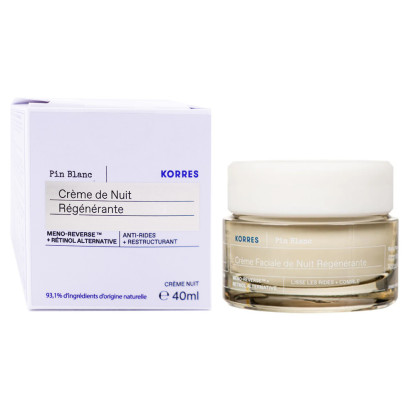 La-Crème de nuit Régénérante de KORRES est un soin à base d’extrait d’écorce de pin blanc, de technologie MENO-REVERSE, d’omégas (3 6 9) et d’extrait de plante Nicotiana Benthamiana. Le pin blanc va agir sur la réduction des rides ainsi que sur la réduction des taches brunes en régulant la synthèse de la mélanine. La technologie MENO-REVERSE participe à la densité et au volume de la peau. Une combinaison d’oméga 3, 6 et 9 participe à l’élasticité et au confort de la peau en la nourrissant en profondeur Un extrait de plante Nicotiana Benthamiana qui est semblable au rétinol augmente la production de collagène de la peau pour aider à la régénérer. Le lendemain, la peau est repulpée, les traits du visage sont reposés et le teint est radieux. Jour après jour, le visage retrouve son éclat, la peau est plus ferme, plus tonique et les signes de l’âge réduits.