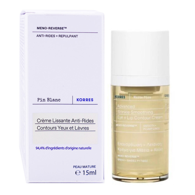 La Crème Lissante Contour yeux et lèvres de KORRES est un soin à base d’extrait naturel de pin blanc, de technologies MENO-REVERSE et LIPO-LIFFING et d’extraits de plantes (fleurs blanches, écorce de pin blanc). Le pin blanc associé à la technologie LIPO-LIFFING vont agir sur le comblement et la réduction des rides autour des lèvres et des yeux, ainsi que repulper et lisser la peau. La technologie MENO-REVERSE participe à la densité et au volume de la peau, quant à l’extrait de fleurs blanches (jasmin et aubépine) agit sur les signes de fatigue (poches et cernes). Sa texture non grasse et non collante qui pénètre rapidement à l’application, laisse la peau très douce après le soin. Jour après jour, le regard retrouve son éclat, la peau du contour des yeux et des lèvres est plus ferme, plus lisse et les signes de fatigue réduits.