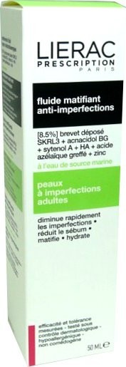 LIERAC est la première marque française dermo-cosmétique spécialisée dans la correction du vieillissement et des désordres cutanés, et instauratrice de la « cosmétique technique » qui allie plaisir des sens et efficacité. La gamme LIERAC PRESCRIPTION peaux à imperfections adultes est constituée de soins experts développés avec la technologie SKRL3 brevetée LIERAC réequilibrante, protectrice et hydratante, pour réguler et assainir les peaux ternes, brillantes, aux pores dilatés et au grain irrégulier. Fluide matifiant anti-imperfections de LIERAC PRECRIPTION, à la texture fraîche et légère, est spécialement conçu pour améliorer la qualité de la peau, matifier et hydrater les peaux adultes sujettes aux imperfections. Sa formule est composée du complexe SKRL3 qui associe eau de source marine réparatrice, probiotique fortifiant et sucre biotechnologique capteur d’eau, de 3 hydroxy-acides aux propriétés exfoliantes de surface qui stimulent le renouvellement cellulaire et améliorent le grain de peau, de zinc sébo-régulateur, apaisant et antioxydant, d’un actif dérivé de l’huile de ricin purifiant, de Syténol A qui réduit la sécrétion de sébum, limite la prolifération du Propionibacterium acnes et apaise la peau, d’acide azélaïque antiseptique greffé sur de la glycérine hydratante et des poudres absorbantes anti-brillance longue durée . Hypoallergénique, non comédogène, sans paraben, sans colorant, parfum sans allergène.