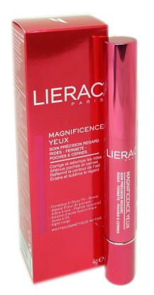 LIERAC est la première marque française dermo-cosmétique spécialisée dans la correction du vieillissement et des désordres cutanés, et instauratrice de la « cosmétique technique » qui allie plaisir des sens et efficacité. La gamme MAGNIFICENCE est constituée de soins antirides d’exception, développés pour agir de façon ciblée sur la glycoxydation : l’altération des protéines fondamentales qui accélère le vieillissement cutané. MAGNIFICENCE YEUX Soin précision regard de LIERAC, à la texture onctueuse et lissante, est spécialement conçu pour lisser les rides, raffermir la peau, corriger les poches et les cernes, embellir la zone fragile du contour de l’œil. Sa composition associe le Complexe D-Glyox breveté LIERAC, puissant complexe anti-âge à base de fleur de grenade, arbre à soie et peptide liposomé, d’acide hyaluronique dosé à 5%, d’extraits de vigne rouge et de vitamines C et E protectrices. Résultats : les rides sont lissées, les poches et les cernes sont atténués, la peau est raffermie, le regard gagne visiblement en jeunesse.