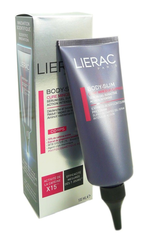 LIERAC est la première marque française dermo-cosmétique spécialisée dans la correction du vieillissement et des désordres cutanés, et instauratrice de la « cosmétique technique » qui allie plaisir des sens et efficacité. La gamme BODY SLIM corps est constituée de soins ciblés, développés pour agir efficacement contre la cellulite, remodeler la silhouette, raffermir et améliorer la qualité de la peau. BODY-SLIM cure minceur express sérum-gel suractivé action intensive de LIERAC, à la texture gel frais et fondant, est spécialement conçu pour réduire l’aspect de la cellulite, affiner la silhouette et lisser immédiatement la peau. Sa formule est composée du WTB System, breveté LIERAC, qui associe 3 actifs (lotus sacré-saule blanc-peptide biotechnologique) capables de transformer les adipocytes « stockeurs de graisses » en adipocytes « brûle-graisses », d’un complexe caféine active dosée à 10% et gingembre booster de caféine, et d’un agent cryo-thermique pour un effet glaçon potentialisateur d’efficacité.