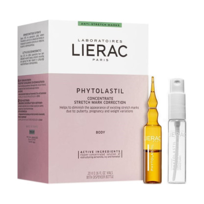 LIERAC est la première marque française dermo-cosmétique spécialisée dans la correction du vieillissement et des désordres cutanés, et instauratrice de la « cosmétique technique » qui allie plaisir des sens et efficacité. La gamme PHYTOLASTIL est constituée de soins ciblés, développés pour lutter contre la dégradation des fibres d’élastine et de collagène, responsable de l’apparition des vergetures. PHYTOLASTIL AMPOULES, sérum correction des vergetures constituées de LIERAC, à la texture non grasse, est spécialement conçu pour restructurer l’épiderme et favoriser la régression des vergetures constituées (profondeur, largeur, longueur, couleur). Sa formule est composée d’une association spécifique d’actifs restructurants : alchemille-lierre-prêle riches en flavonoïdes et tanoïdes, capables de relancer la synthèse des fibres de collagène et d’élastine. Résultats positifs dans 80% des cas.