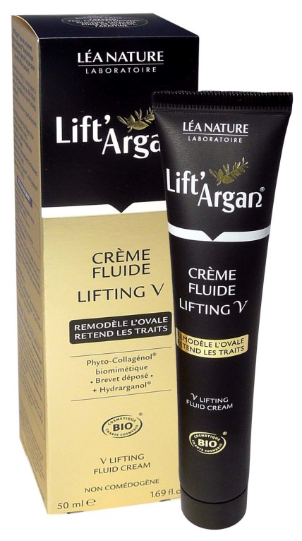 Crème fluide Lifting V est un soin anti-âge concentré composé de Phyto-Collagénol biomimétique qui est un brevet Lift’Aragan, d’Hydrarganol (développé par Lift’Argan) riche en polysaccharides, ainsi que d’huile d’argan. Ces actifs vont favoriser la bonne production du collagène pour un effet tenseur et raffermissant en apportant du collagène végétal biomimétrique, booster la néosynthèse de collagène par les fibroblastes pour un effet raffermissant, et lifter la peau instantanément pour estomper l’apparition des rides et ridules, tout en améliorant la texture de la peau, en redessinant l’ovale du visage, et en hydratant intensément la peau pour lutter contre la déshydratation. Sa texture crème légère fluide pénètre rapidement avec un effet ultra-galbant. Dès l’application, la peau est comme liftée avec une sensation d’un film qui s’étire sur l’ensemble de la zone V du visage, rides et ridules sont estompées