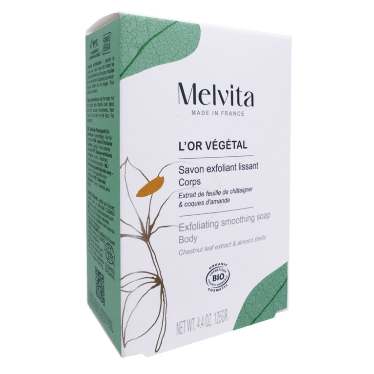 Découvrez le savon exfoliant pour le corps Melvita Bio L'Or Végétal, en vente en ligne sur le site de votre parapharmacie à prix discount. Ce savon est formulé à base d'extrait de feuille de châtaignier et de coques d'amande pour une exfoliation en douceur et une peau lisse et éclatante.