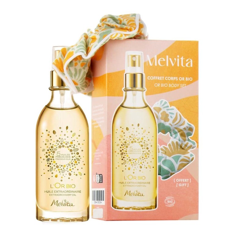 MELVITA COFFRET CORPS OR BIO HUILE EXTRAORDINAIRE + CHOUCHOU