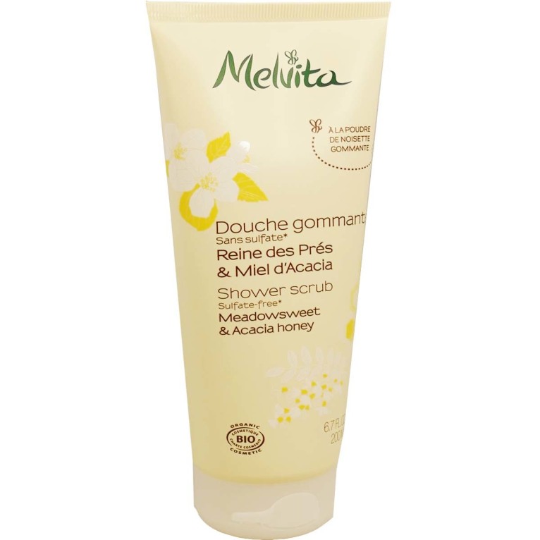 MELVITA, marque pionnière de la cosmétique BIO, est née de la passion d’hommes pour le miel, cette merveilleuse substance située entre le mode animal et végétal. Depuis près de 40 ans, MELVITA développe des produits dermo-cosmétiques en allégeant au maximum son impact sur la planète et en protégeant la nature et les abeilles. MELVITA offre la garantie de produits composés d’ingrédients naturels et biologiques, exempts de matières pétrochimiques peu biodégradables, pour toujours offrir le meilleur et le plus beau de la nature. La gamme des gels douches bio Miels & Fleurs de MELVITA est composée de soins formulés avec des bases lavantes extra-douces et sans savon, biodégradables jusqu’à 99% en 28 jours, et dont la texture allie onctuosité et senteurs délicates de mélange unique de fleurs, miel bio et gelée royale avec des parfums 100% naturels. Douche Gommante bio de MELVITA, est un soin à la base lavante extra-douce spécialement conçu pour nettoyer, gommer en douceur la peau et éliminer impuretés et cellules mortes par sa texture crème à la poudre de noisette, régénèrer la peau et l’apaiser instantanément de tout inconforts. Après le soin, le gommage corporel à la texture onctueuse et veloutée laisse la peau souple et très douce en enveloppant le corps d’un parfum délicat floral de reine des près et miel d’acacia. Sans sulfates