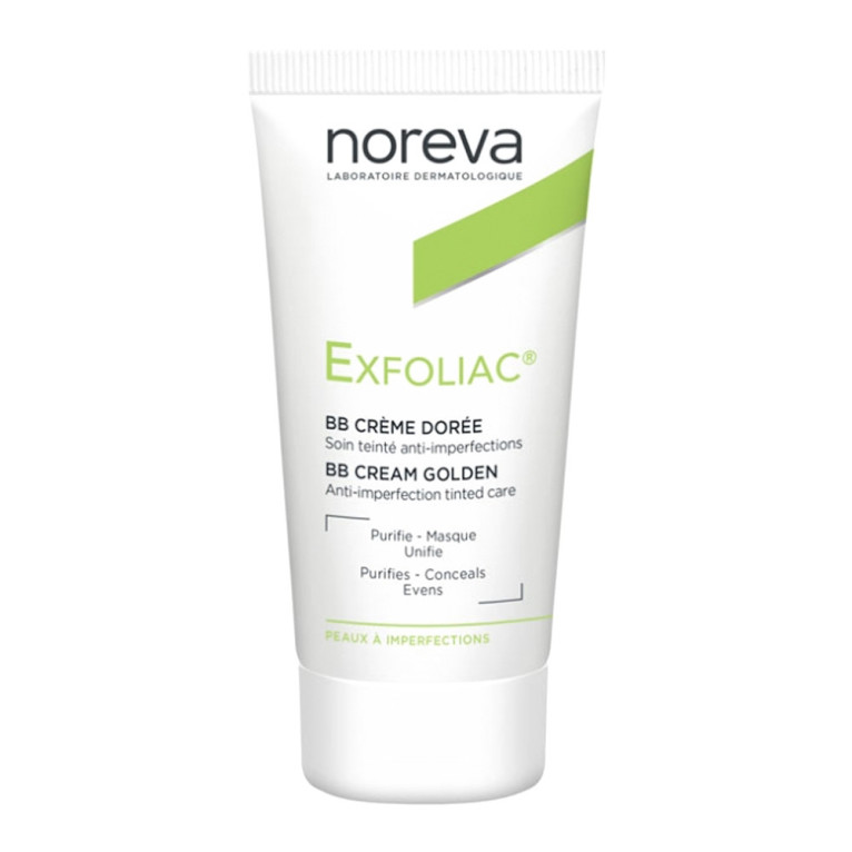 EXFOLIAC soin anti-imperfections teinté doré des laboratoires NOREVA, le soin conçu par des dermatologues pour corriger et masquer les imperfections, purifier et matifier les peaux acnéiques.