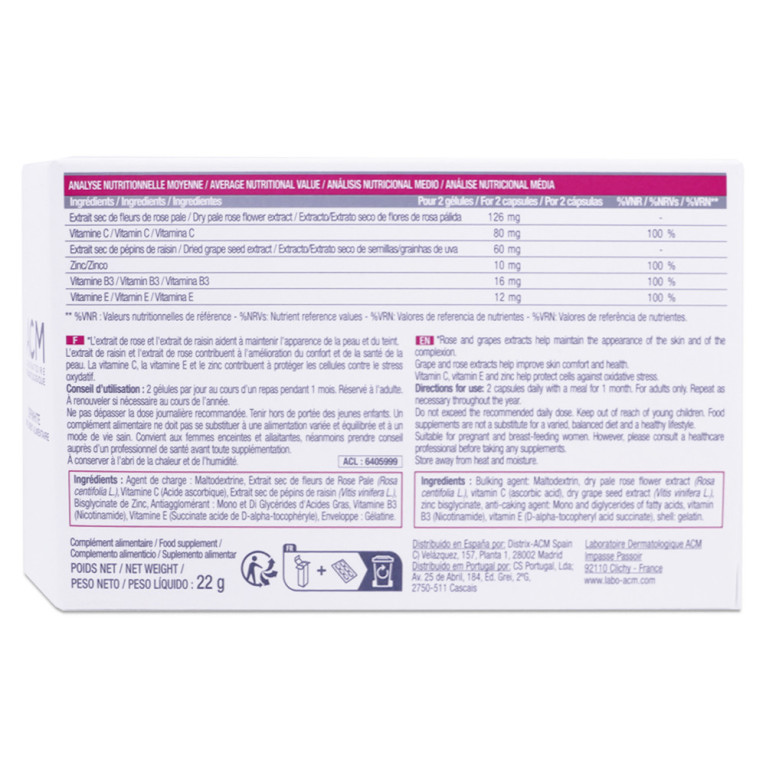 Ce complément alimentaire proposé par le laboratoire ACM se compose d'un mélange synergique d'extrait de pépins de raisin, d'extrait de rose, de zinc et de vitamines.