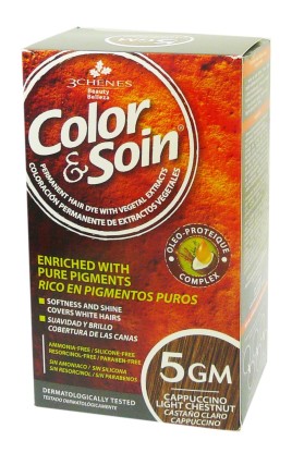 Color & Soins coloration permanente aux extraits végétaux des laboratoires 3 Chênes, efficacité, naturalité et innovation dans une coloration qui offre soin et reflets intenses aux cheveux, protection et douceur aux cuirs chevelus les plus sensibles. 5GM Châtain clair.