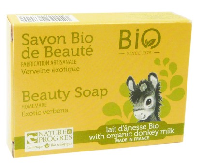 Nature & Progrès propose des produits sains et qualitatifs conçus de façon à préserver la nature et sa biodiversité. Les savons naturels biologiques certifiés Nature & Progrès sont conçus avec 10% de lait d’Anesse d'élevage Français et fabriqués de façon artisanale. Ces savons offrent de formidables bienfaits à la peau grâce à leurs propriétés hautement régénérantes. Le lait d’ânesse, riche en protéines, phospholipides, céramides et glucides, est un tenseur naturel, préconisé dans le traitement des peaux sèches, du psoriasis ou de l’eczéma. Ces savons sont particulièrement indiqués pour la toilette des peaux sensibles, irritables et conviennent parfaitement aux peaux des bébés. Savon délicatement parfumé aux huiles essentielles de verveine.