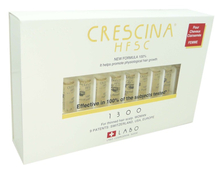 Crescina HSFC 1300 femme de LABO COSPROPHAR, le traitement sous forme de lotion en ampoules qui s’utilise en cas de chute de cheveux physiologique au cuir chevelu très clairsemé à raréfaction importante voir très étendue chez les femmes.
