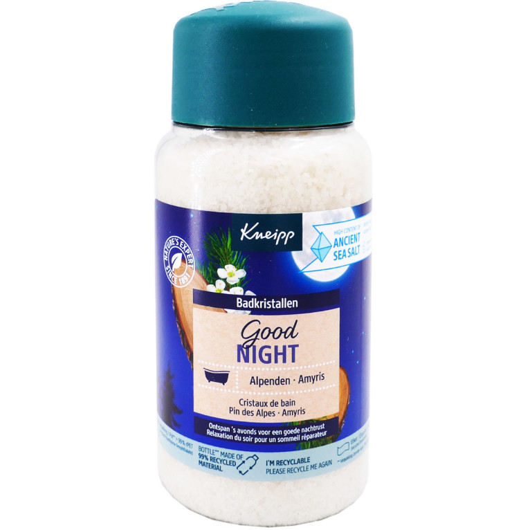 Les cristaux de bain Good Night contiennent des huiles essentielles de Pin des Alpes et d’Amyris destinées à se relaxer, à aider à favoriser le sommeil, et à apaiser de toute anxiété ou stress, tout en prenant soin de la peau pour l’hydrater et l’adoucir. Après le bain la peau est agréablement parfumée et retrouve toute sa douceur, le corps et l’esprit sont relaxés pour retrouver le calme avant le coucher. Vegan. Aux actifs d'origine végétale Sans conservateur (selon la réglementation européenne), sans silicones, sans huiles minérales, testé sous contrôle dermatologique. Peut être utilisé dans une baignoire de balnéothérapie.