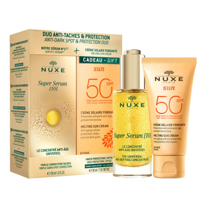 Découvrez le NUXE DUO ANTI-TACHES & PROTECTION SUPER SERUM 10 + CREME SOLAIRE SPF50, une combinaison de soins de la célèbre marque française Nuxe.