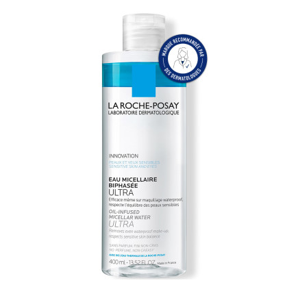 L’Eau micellaire Biphasée Ultra, à la formule sans alcool, sans silicones et sans parfum, respectueuse des peaux sensibles, riche en Eau thermale de La Roche Posay, est spécialement conçue pour nettoyer en douceur, éliminer les impuretés, particules de pollution et le maquillage, et apaiser de tout inconfort. Biphasée, elle est formulée de 90% d’eau micellaire et 10% d’huile afin de capturer la totalité des impuretés et du maquillage même le plus résistant. Sa formule minimaliste au pH5 contient seulement 10 ingrédients pour respecter l’équilibre de la peau sensible. Non collante et non grasse, la peau propre, retrouve confort et douceur. Formule haute-tolérance testé sous contrôle dermatologique et ophtalmologique sur peaux sensibles