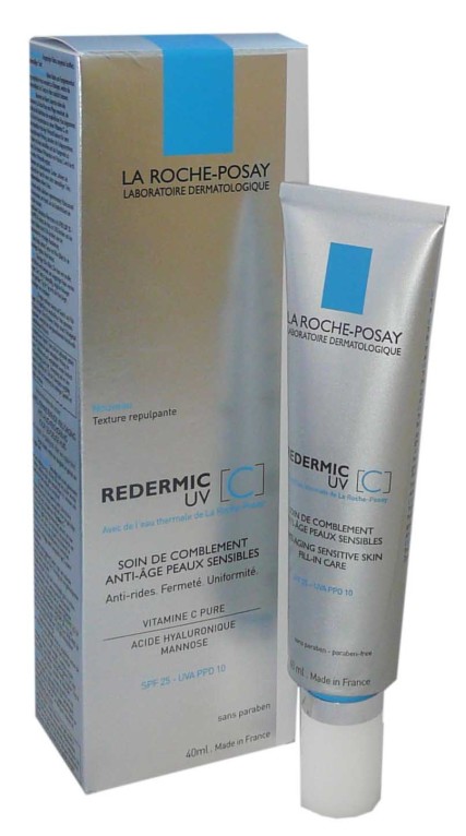 Depuis plus de 30 ans, le laboratoire LA ROCHE POSAY développe des produits dermo-cosmétiques élaborés avec de l’eau thermale de LA ROCHE POSAY riche en Sélénium aux propriétés anti-radicalaires, pour répondre à tous les besoins des peaux même les plus fragiles. La gamme REDERMIC propose des produits élaborés à base d’actifs dermatologiques de pointe pour offrir une efficacité anti-âge aux peaux les plus sensibles. REDERMIC [C] UV, à la texture fraîche et légère, qui pénètre la peau sans effet de gras pour un fini velouté, est un soin spécialement conçu pour raffermir la peau, corriger les rides même profondes, et unifier le teint des peaux sensibles. Sa formule innovante associe de la vitamine C qui stimule la production de collagène, à de l’acide hyaluronique repulpant, du Mannose, sucre capable de flouter les irrégularités cutanées, du Madécassoside réparateur, de la Neurosensine apaisante et un système filtrant SPF 25 pour une protection renforcée contre les UVA/UVB. Résultat : les rides sont corrigées, la peau retrouve sa fermeté, le teint s’uniformise et le visage gagne en jeunesse.