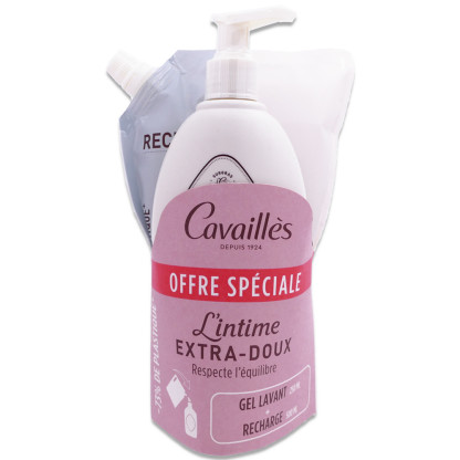 ROGE CAVAILLES L'INTIME EXTRA DOUX GEL LAVANT + RECHARGE est en vente en ligne sur le site de votre parapharmacie à prix discount, conçu pour l'hygiène intime quotidienne des peaux sensibles.