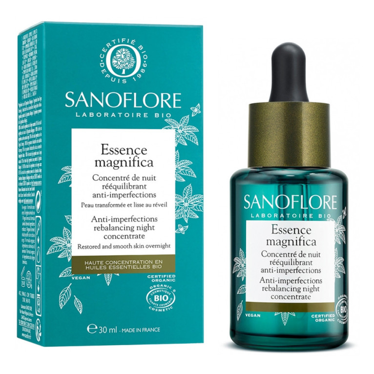 SANOFLORE extrait toutes les richesses du végétal et les incorpore dans une gamme de soins de beauté élaborés à base d’eaux florales et d’huiles essentielles, pour offrir le meilleur de la nature aux peaux les plus sensibles. Les soins de la gamme Magnifica sont élaborés à base d’huiles essentielles et d’extrait de menthe poivré pour offrir leurs propriétés antibactériennes, anti-inflammatoires, antioxydantes et sublimatrices aux peaux sujettes aux imperfections. L’Essence Magnifica est une huile sèche purifiante, enrichie de 9 huiles essentielles bio, spécialement conçue pour purifier la peau sans la dessécher, agir sur la cause des imperfections, resserrer les pores et illuminer le teint des peaux à imperfections. Sa texture huile non grasse pénètre rapidement à l’application pour laisser la peau très douce. Jour après jour, les pores sont resserrées les imperfections éliminées, la peau est comme neuve et le teint retrouve sa fraicheur. Non comédogène. Sans paraben, Sans silicones, Sans huiles minérales