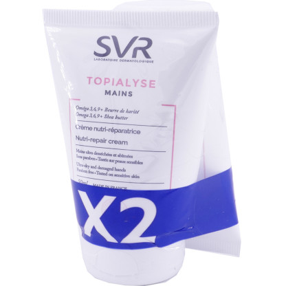 SVR est une marque dermocosmétique française depuis 1962. Le laboratoire propose des solutions dermatologiques efficaces, pour tout type de peaux. SVR est une gamme complète de soins émollients et lavants sans compromis, qui garantit une action anti-grattage renforcée et un maximum de confort et de tolérance. Avec Topialyse, soulager les peaux sèches redevient un moment de plaisir ! La formule ultra-concentrée de TOPIALYSE MAINS en phase grasse (27%) et en beurre de karité (7%) procure une nutrition intense et un confort immédiat. Enrichie en Omégas 3, 6 et 9, TOPIALYSE MAINS restaure la barrière cutanée. Protégées, même en conditions extrêmes, les mains sont plus douces et plus lisses. TOPIALYSE Mains de SVR est spécifique pour les mains sensibles, sèches et abîmées ; sa texture ultra-fondante au fini poudré et toucher velours, sa pénétration rapide sans fini gras ou collant et son parfum subtil sans allergène aux notes boisées et fruitées en font une crème main indispensable au quotidien ! Haute tolérance ; 100% testée sur peaux sensibles. Sans paraben. Sans silicone. Sans huile minérale.