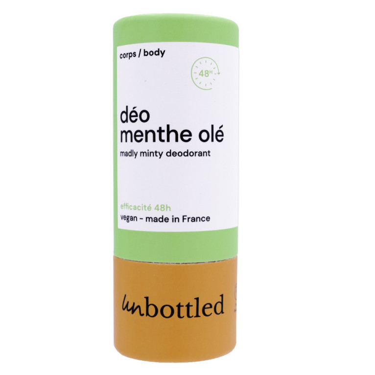 Découvrez le déodorant UNBOTTLED DÉO MENTHE OLÉ 48H, formulé par le laboratoire renommé pour ses produits de qualité. Ce déodorant offre une protection longue durée de 48 heures tout en laissant une sensation de fraîcheur intense grâce à son parfum mentholé (avec huiles essentielles). Sa formule enrichie en magnésium et en zinc offre une action antibactérienne efficace pour lutter contre les mauvaises odeurs. Sa texture légère et fondante permet une application facile et agréable tout au long de la journée. Le déodorant en carton recyclable et sans plastique, au parfum frais mentholé, permet d'économiser l'équivalent de deux déodorants roll-on ou spray.