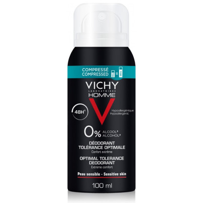 C’est au cœur d'une nature préservée, sur les terres volcaniques d’Auvergne, que l’eau de Vichy prend sa source. L’Eau Volcanique de VICHY est l'actif star des formules de soin VICHY. La gamme de soins proposée par le laboratoire Vichy est fabriquée en France depuis 1931. Chaque matière première utilisée répond à une charte hypoallergénique. La formule de ce déodorant spray compressé pour homme offre une efficacité 48h & une haute tolérance pour un confort extrême ; est hypoallergénique & sans alcool ; convient aux peaux sensibles et les protège pendant 48h et est économique grâce au format compressé car autant d’utilisation qu’avec un format 200ml. Avec 32% de packaging en moins, le spray compressé permet le même nombre d'utilisations et la même efficacité qu'un spray 200ml.