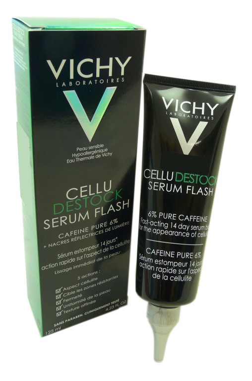 VICHY a conçu une gamme de soins ciblés, hautement concentrés en actifs experts pour réduire visiblement les volumes localisés, éliminer les capitons et estomper l’aspect des vergetures : DESTOCK. Le sérum, à la texture légère non grasse et non collante, est un soin spécialement formulé pour améliorer l’aspect de la cellulite, réduire les volumes rebelles et agir sur la qualité de la peau en la tonifiant et en la raffermissant. Ce soin combine l’efficacité de la caféine pure hautement dosée, aux propriétés repulpantes de l’acide hyaluronique et aux qualités embellissantes des nacres réflectrices. Résultat : les capitons sont réduits en 14 jours, la silhouette visiblement affinée en 4 semaines. Formule hypoallergénique enrichie à l’eau thermale de Vichy, sans paraben.