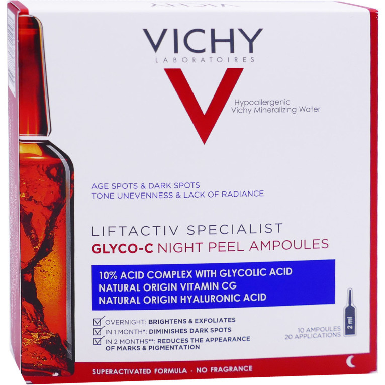 VICHY a conçu une gamme de soins pour le visage destinés à lutter efficacement contre les effets de vieillissement, rides profondes et perte de fermeté, tout en offrant un teint unifié et un effet lifting durable : LIFTACTIV SPECIALIST Ampoules Peeling Nuit LIFTACTIV SPECIALIST Glyco-C est un sérum peeling de nuit sous forme d’ampoules, conçu pour estomper l’hyperpigmentation et redonner de l’éclat au visage nuit après nuit. Ce soin est composé d’un complexe d’acide glycolique (10%), d’acide hyaluronique d’origine naturelle (haut et bas poids moléculaire) et de vitamine Cg d’origine naturelle, associé à l’Eau thermale Minéralisante de Vichy pour estomper les taches pigmentaires et liées à l’âge, marques d’acné) tel un peeling, repulper l’épiderme et hydrater intensément et en profondeur pour préserver l’eau dans les cellules cutanées, tout en redonnant de l’éclat au teint. Résultat : la peau est en une nuit lissée, et lumineuse, les taches diminuent visiblement et le visage gagne en éclat jour après jour ! Efficacité cliniquement prouvé Hypoallergénique, sans parfum.