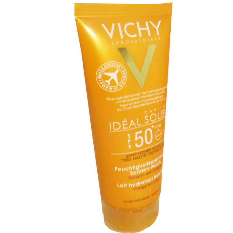 Vichy a conçu une gamme de soins de protection solaire enrichis en Eau Thermale de Vichy fortifiante et régénérante pour offrir aux peaux sensibles toutes les vertus apaisantes et fortifiantes de cette eau rare, tout en luttant efficacement contre les effets néfastes du soleil : IDEAL SOLEIL. Le Lait hydratant fraîcheur qui s’étale facilement, est spécialement formulé pour assurer une protection solaire très efficace et minimiser le risque d’allergie. Les laboratoires VICHY ont intégré dans sa composition un système filtrant large spectre UVA-UVB et photostable à base de Mexoryl® (brevet déposé) qui assure une protection optimale contre les effets néfastes des UV. Sa texture lactée laisse sur la peau de la fraîcheur dès l’application sans laisser de traces blanches. Pratique par son petit format, la protection s’emporte partout avec soi, même dans les bagages à mains lors de voyage en avion. Formule résistante à l’eau. Hypoallergénique testée sous contrôle dermatologique. Adapté aux peaux sensibles. Sans parfum, sans paraben