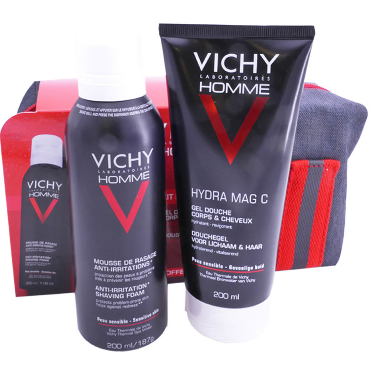 La trousse « Kit Essentiel » de VICHY, une jolie trousse destinée à prendre soin du visage et du corps des hommes aux peaux sensibles dès le début de la journée ! Hydra Mag C Gel douche corps et cheveux (200ml) et Mousse de rasage anti-irritations (200ml). Une belle trousse à offrir ou à se faire offrir !