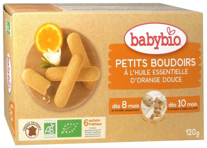 Les boudoirs de BABYBIO sont de délicieux goûters pour les bébés dès 8 mois fondants à la saveur gourmande et naturelle d’huile essentielle d’orange douce sans ajout de sucres pour faire découvrir de nouvelles textures. Dès 4 mois, la diversification alimentaire se fait tout en douceur en alternant avec les biberons de lait. Les Boudoirs BABYBIO peuvent être donnés aux tout-petits dès 8 mois en bouillie, mélangé à du lait infantile ou bien à la main. Ces boudoirs adaptés raviront les papilles des bébés! Pratique par l’emballage en sachet fraîcheurs, les boudoirs peuvent être emmenés partout avec soi. Sans sucres ajoutés. Contient du gluten. Peut contenir des traces d'arachides, de soja, de sésame, de lait et de fruits à coque.