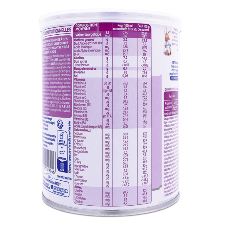 Il contient un hydrolysat de caséine, qui participe à une digestion facilitée, et est spécialement conçu pour les enfants de 0 à 36 mois présentant des allergies aux protéines de lait de vache avec régurgitations. Ce lait en poudre sans lactose, est formulé pour soutenir la fonction digestive en limitant les régurgitations grâce à la caroube, et aider au fonctionnement normal de l'organisme des tout-petits, tout en répondant à leurs besoins nutritionnels.