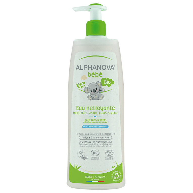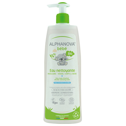 Eau nettoyante d'ALPHANOVA dans votre parapharmacie en ligne à prix discount, l'eau qui nettoie tout en douceur les peaux sèches et très sensibles le visage, le corps et le siège des bébés.