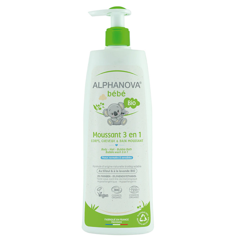 Moussant 3 en 1 corps cheveux bain moussant d'ALPHANOVA dans votre parapharmacie en ligne à prix discount, le gel moussant qui nettoie tout en douceur les peaux fragiles et les cheveux des bébés, et qui peut aussi s'utiliser pour le bain.