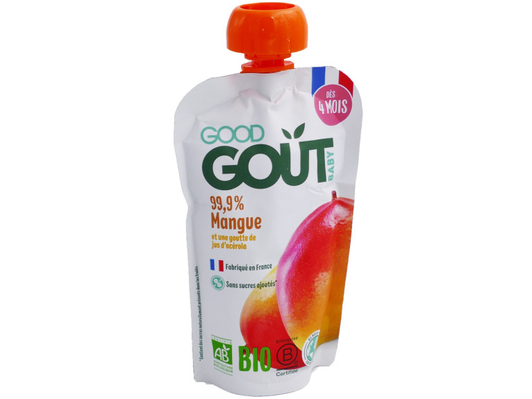Purée de Fruits Bio discount de GOOD GOUT, démarrer la diversification alimentaire en douceur dans votre parapharmacie en ligne à prix discount, avec cette gourde au bon fruit gourmands pour faire découvrir de nouvelles saveurs aux bébés, dès 4 mois Mangue