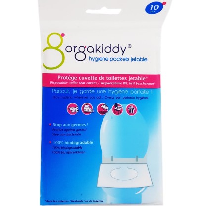 Le laboratoire français ORGAKIDDY développe des produits innovants et pratiques à usage unique pour l’hygiène et le confort des tout-petits et de leurs parents (bavoirs jetables, protège-matelas,…). Le Protège Cuvette jetable permet d’aller aux toilettes publiques en toute tranquillité. Leur format extra-large permet de recouvrir entièrement la cuvette sur les bords et devant et ainsi protéger des bactéries et des germes pour pouvoir aller aux toilettes en sécurité lors de déplacements (aire d’autoroute, restaurant,…). 100% biodégradable pour respecter l’environnement, le protège-cuvette peut s’éliminer avec la chasse d’eau des WC. Pratique par le format individuel, le protège cuvette permet d’être transporter.