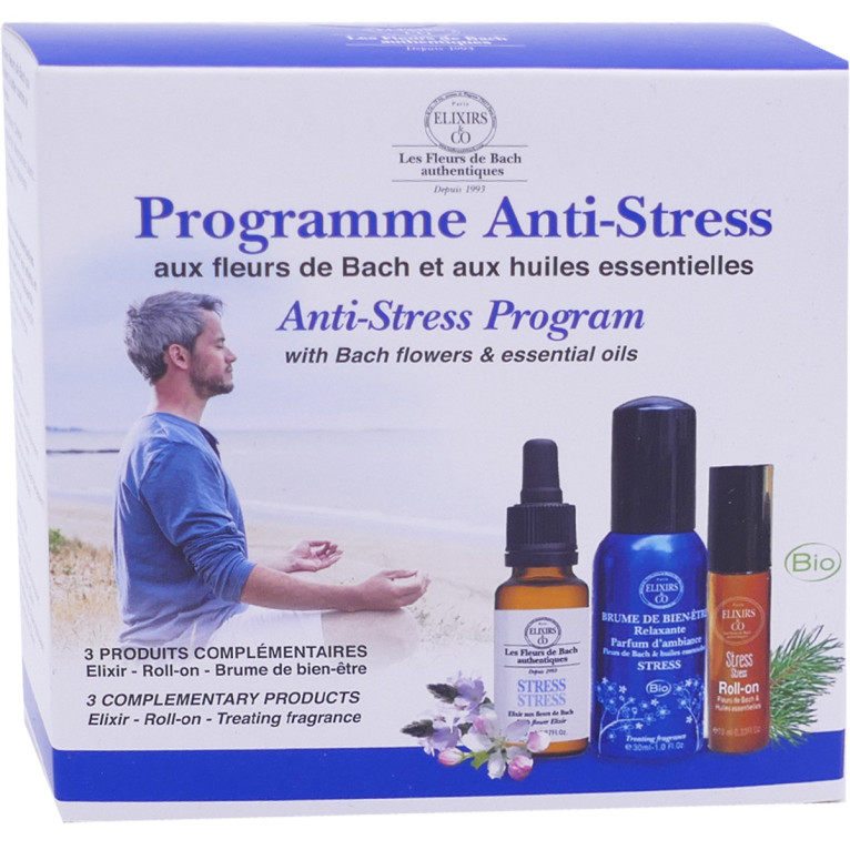 La gamme ELIXIRS & CO est conçue à partir de FLEURS DE BACH, végétaux naturels pour contribuer au bien-être, et à l'équilibre émotionnel et naturel. Programme Anti-stress Coffret 3 produits complémentaires d’Elixirs & Co est composé d’un Roll-on Stress (10ml), d’une Brume de bien-être Relaxante en spray (30ml) et d’un élixir STRESS en gouttes à diluer (20ml).