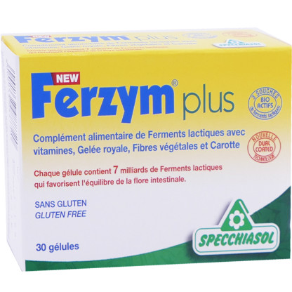 FERZYM PLUS New du laboratoire SPECCHIASOL discount, un complément alimentaire en gélule à base de ferments lactiques associées à des vitamines, gelée royale, fibres végétales et carotte, dans votre parapharmacie en ligne à prix discount.