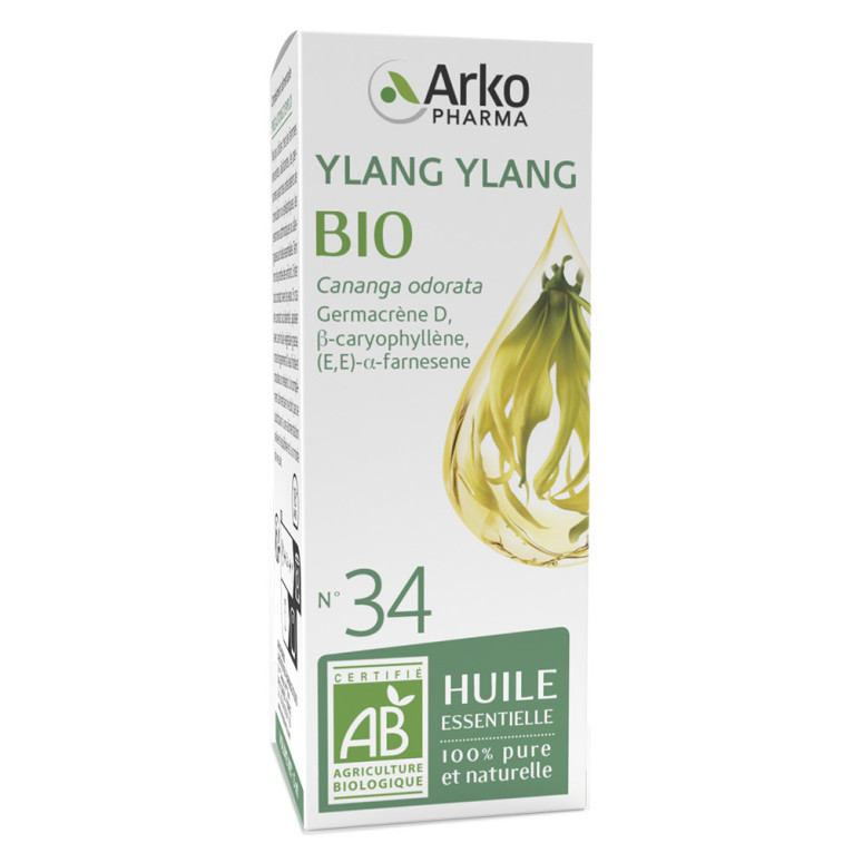 Le laboratoire Arkopharma choisi des huiles essentielles bio de qualité supérieure HEBBD (botaniquement et biochimiquement définies), 100 % pures et naturelles non coupées, non diluées, non reconstituées, garantit les contrôles organoleptique et analytique de l’identité, de l’origine et de la qualité de chacune des huiles essentielles, garantit un mode de production excluant l’utilisation d’OGM, de pesticides et d’engrais chimiques de synthèse et garantit un procédé de distillation à la vapeur d’eau basse pression ou par expression à froid. L’huile essentielle Bio d’Ylang-ylang possède plusieurs vertus : anti-inflammatoire, antidépressive, stimulante sexuel, et antifatigue. Elle va soulager lors spasmes et de douleurs au niveau abdominal, stimuler la libido avec son effet aphrodisiaque, et apaiser lors de stress et anxiété pour emmener vers la détente et favoriser un sommeil de qualité. L’huile essentielle bio Ylang-ylang Arkopharma s’utilise en application cutanée, par voie orale, pour parfumer l’intérieur, dans les produits cosmétiques.