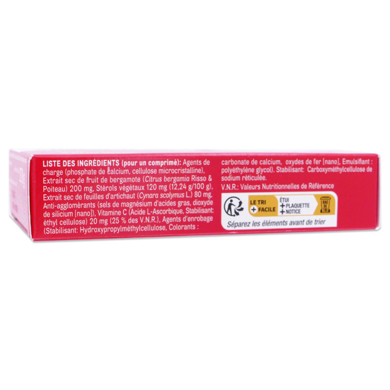 Agents de charge (phosphate de calcium, cellulose microcristalline, phosphate dicalcique), Extrait sec de fruit de bergamote (Citrus bergamia Risso & Poiteau) 200 mg, Stérols végétaux 120 mg (12,50 g/100 g), Extrait sec de feuilles d'artichaut (Cynara scolymus L.) 80 mg, Anti-agglomérants (sels de magnésium d'acides gras, dioxyde de silicium [nano]), Vitamine C (Acide L-Ascorbique, Stabilisant : Ethyl cellulose) 20 mg (25 % des V.N.R.), Agents d'enrobage (Stabilisant : Hydroxypropylméthylcellulose, Colorants : carbonate de calcium, oxydes de fer [nano], Emulsifiant : polyéthylène glycol. Stabilisant : Carboxyméthylcellulose de sodium réticulée .V.N.R. : Valeurs Nutritionnelles de Référence.