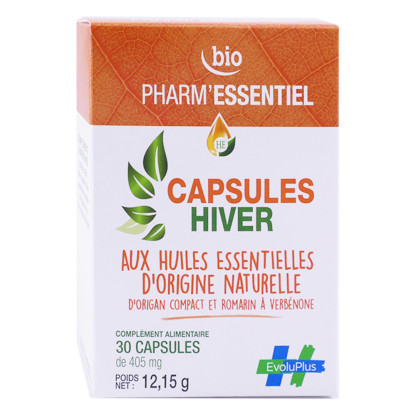 Capsules Hiver Pharm’Essentiel Bio EvoluPlus discount d’EVOLUPHARM, un complément alimentaire à base d’huiles essentielles conditionnées en capsules à avaler, dans votre parapharmacie en ligne à prix discount.