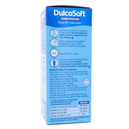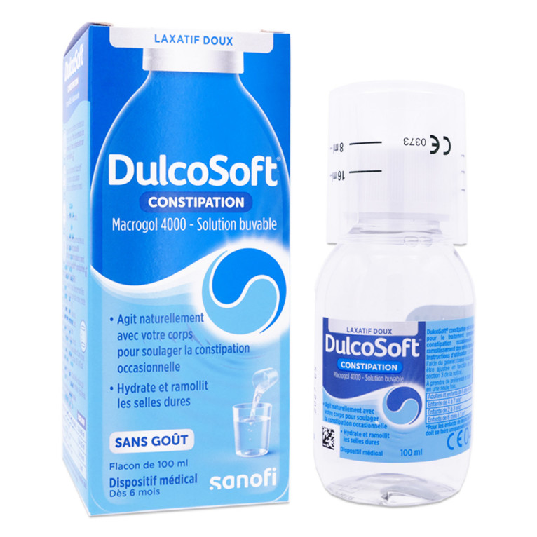 base de macrogol 4000 qui est un laxatif osmotique, DULCOSOFT Constipation est un dispositif médical sous forme de solution buvable au gout neutre, qui va augmenter la quantité d’eau dans le colon et ainsi faciliter l’évacuation des selles en les ramollissant, et aider à obtenir des selles régulières. Rapidement, les selles redeviennent normales et régulières pour retrouver bien-être intestinal et confort. DULCOSOFT Constipation est toléré chez les femmes enceintes et allaitantes, les personnes diabétiques, et les personnes suivant un régime alimentaire pauvre en sodium. Sans lactose, sans gluten