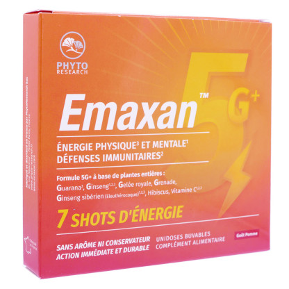 EMAXAN 5G+ 7 SHOTS D'ÉNERGIE GOÛT POMME 7X10ML : Découvrez un concentré d'énergie en vente en ligne, sur le site de votre parapharmacie à prix discount. Ce complément alimentaire est idéal pour booster votre vitalité au quotidien