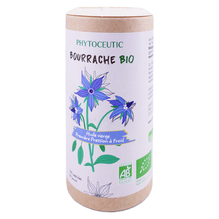 BOURRACHE des Laboratoires PHYTOCEUTIC est un complément alimentaire sous forme de capsules à base d'huile de Bourrache. La Bourrache est une plante de la famille des Boraginacées poussant dans les régions méditerranéennes. Elle est caractérisée par ses magnifiques fleurs en forme d'étoile de couleur bleue. L’huile de bourrache de ce complément alimentaire est pressée à froid et est choisie par les laboratoires Phytoceutic en raison de sa teneur en acide gamma-linolénique (GLA), un acide gras essentiel appartenant à la famille des Oméga-6.