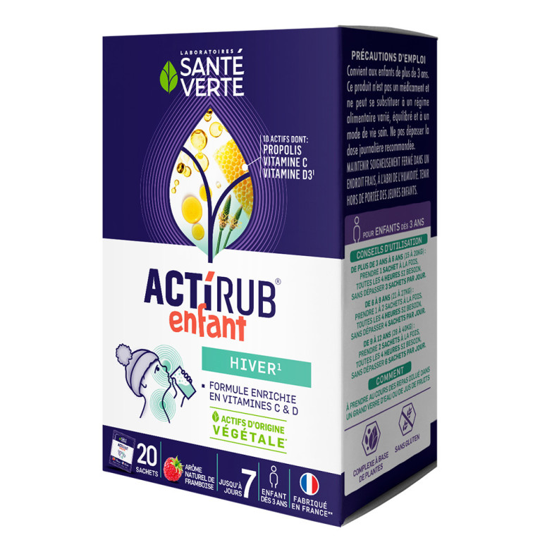 ACTI’RUB Enfant des laboratoires SANTE VERTE est un complément alimentaire en sachet à diluer, à l'arôme Framboise. Sa formule est à base de 10 ingrédients dont des vitamines, 6 plantes et propolis. Dans cette formule, parmi les vitamines on retrouve de la vitamine D qui participe au fonctionnement normal du système immunitaire chez les enfants.