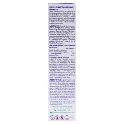 Information nutritionnelle moyenne par ampoule Extrait de mélisse et aubépine 5,2 g Extrait de concentré de végétaux 5,2 g dont mélatonine 1 mg Extrait de tilleul 50 mg