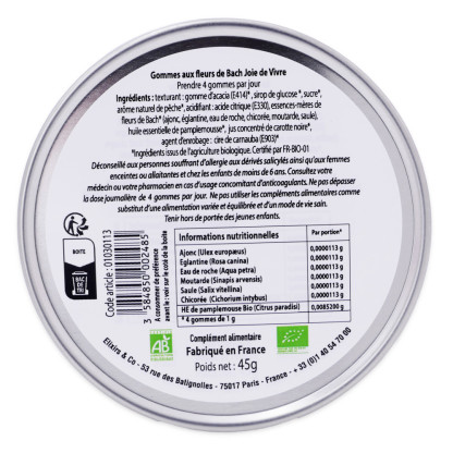 Gomme d’acacia*, sirop de glucose *, sucre de canne*, arôme naturel de pêche*, acidifiant : acide citrique, essences-mère de Fleurs de Bach* ( ajonc, églantine, eau de roche, moutarde, saule) jus concentré de carotte noire*, huile essentielle de pamplemousse*, agent d’enrobage : huile de tournesol*, cire de carnauba*.* Ingrédients issus de l’agriculture biologique. Certifié par FR-BIO-01Peut contenir des traces d’oeufs, de fruits à coques et de blé.