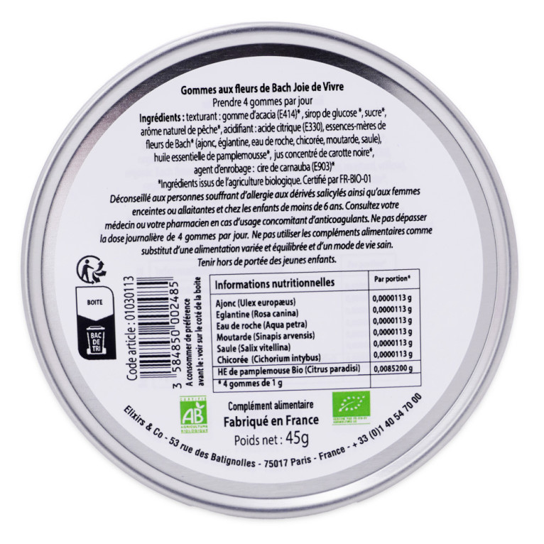 JOIE DE VIVRE Pastilles aux Fleurs de Bach d’Elixirs & Co est composé de plusieurs fleurs de Bach: ajonc, églantine, eau de roche, moutarde, saule. A ces Fleurs de Bach est associée de l’huile essentielle de pamplemousse. Ces pastilles ont une texture tendre et un bon goût de pêche - pamplemousse.