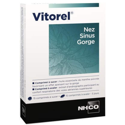 VITOREL est conditionné sous forme de comprimés à sucer et à croquer. Il s'agit d'un complément alimentaire formulé à base d’huiles essentielles, de plantes, et de vitamines. Les comprimés à sucer sont constitués d'huiles essentielles de menthe poivrée et d'eucalyptus globulus. Ces deux huiles essentielles ont un effet apaisant et agréable sur la gorge, le pharynx et les cordes vocales. Les comprimés à avaler sont composés entre autre d'extrait d'andrographis qui aide à adoucir les troubles respiratoires comme la toux, les maux de gorge de manière naturelle. Ils contiennent également de la vitamine D qui participe au fonctionnement normal du système immunitaire.