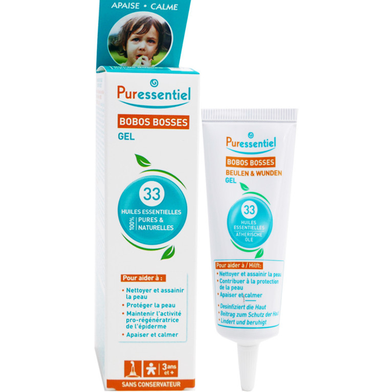 PURESSENTIEL Gel Bobos Bosses est un soin formulé à base de 33 huiles essentielles aux propriétés réparatrices, apaisantes et assainissantes pour soulager rapidement les petits bobos (démangeaisons, ampoules, piqûres d’insectes, sensations de brûlures légères, bosses). Ce soin de premier secours va également participer à la protection de la peau et l’activité pro-régénératrice. Sa texture non grasse et non collante pénètre facilement à l’application et laisse la peau douce.