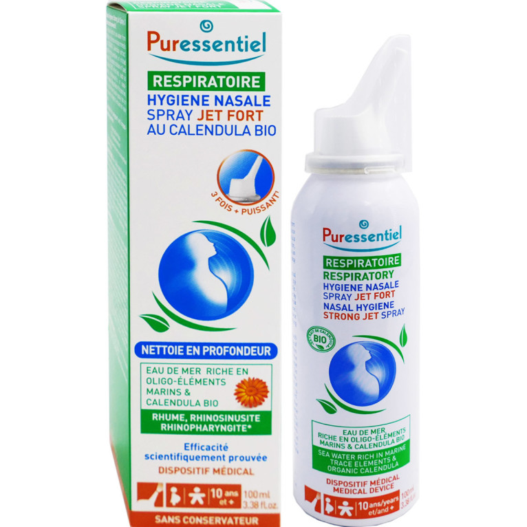 Le Spray Nasal Jet Fort est un spray composé d’un extrait de calendula Bio associé à de l’eau de mer de Bretagne (riche en oligo-éléments marins), 3 fois plus puissant que le jet du Spray Hygiène Nasale Hydratant. Il est spécialement formulé pour nettoyer en profondeur le nez sec sensible et irrité en douceur, libérer les fosses nasales, sans agresser. En spray multidirectionnel avec un embout micro-diffusion ergonomique, le spray nasal jet fort est facile d’utilisation pour un nettoyage tout en douceur. PURESSENTIEL Respiratoire Spray Nasal Jet Fort est apprécié lors de rhume, rhinite allergique et rhinopharyngites. Ce produit convient aux femmes enceintes et allaitant, et aux enfants à partir de 10 ans.
