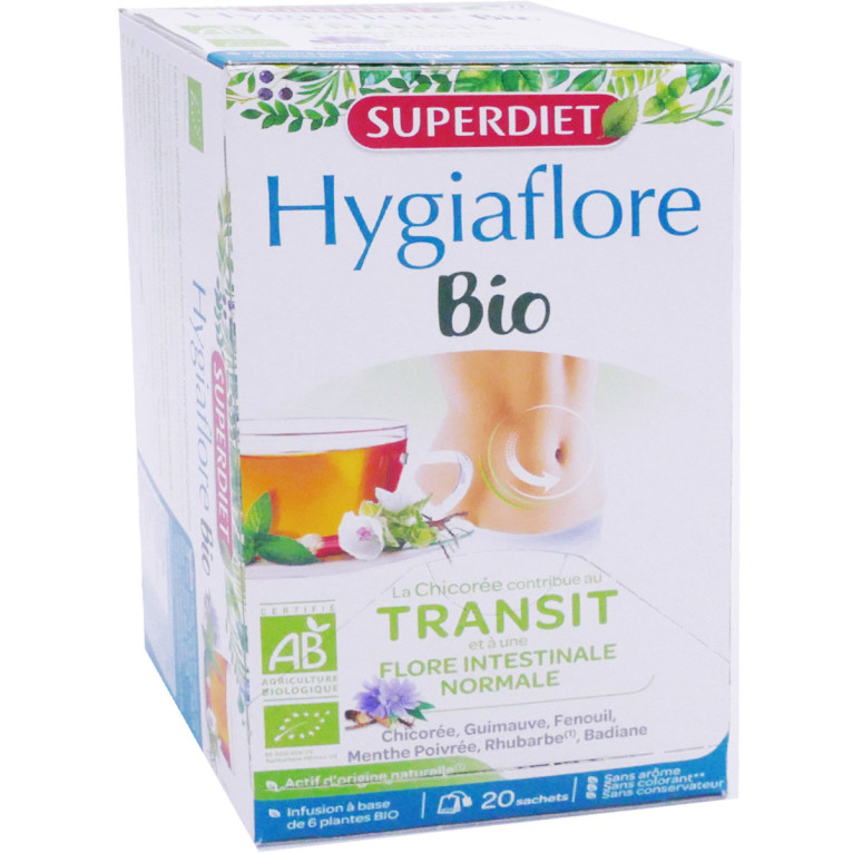 HYGIAFLORE Bio Infusion de SUPERDIET, est à base de chicorée et de rhubarbe, qui contribue au transit intestinal. De la menthe poivrée, de la guimauve, du fenouil et de la badiane viennent compléter ce complément alimentaire.